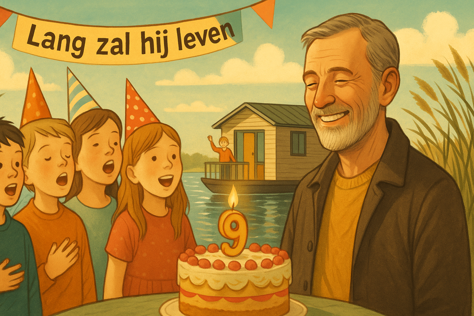 Aan de Wijde Blik in Kortenhoef viert Jan zijn 69e verjaardag op de woonark samen met Anja, Tom, Fieke, Romy, Emma en Tiemen. Kaarsjes, taart en slingers maken het feest compleet. Familie en vrienden zingen hem toe: een warme dag vol liefde, geluk en nostalgie.