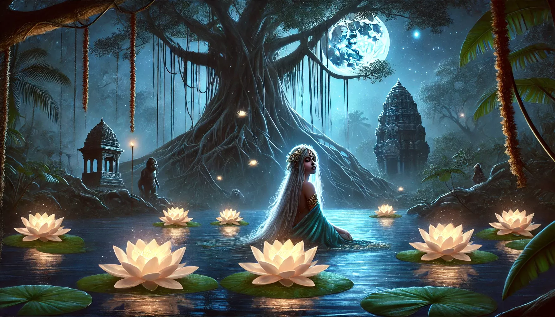In een verborgen Indisch oerwoud, waar de maan het water in zilver baadt, wacht een betovering op verlossing. Nayantara, een jonge zeemeermin met een dromerige ziel, ontdekt zeven waterlelies die meer zijn dan bloemen. Haar reis door duistere diepten brengt haar oog in oog met mythische wezens en haar eigen moed.